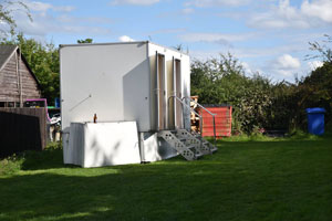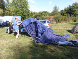 Enter Friday morning, and a beautiful day saw all manner of exciting things begin to unfold. Firstly the traditional fire lane, which was a matter of some import considering the shape and size of the campsite. Getting everyone in needed just a little bit of common sense and co-operation, but as no one was befuddled by either cider or glue it all passed off without incident, and even the small intestine at the top of the field filled up as everyone acted with astonishing common sense. Better still, the portable toilets rolled up mid-morning and soon everyone was able to enjoy their chintzy delights. This rather luxurious establishment had been booked on the understanding that it would suffice for some 200 persons from Friday to Tuesday morning without needing a service call. As it turned out the suppliers had clearly not allowed for the capacity of our collective bowels, and it needed seeing to on the Sunday morning, but at this early stage we were simply amazed by the supply of moisturising cream it came with and regarded it with some respect.