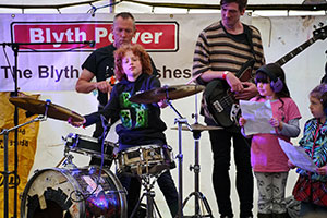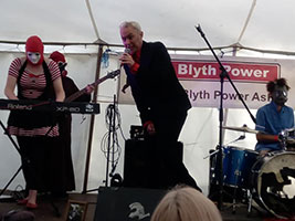 Sunday it rained. Mostly a sort of persistent drizzle, and we are grateful to all those who put up with the cold, the damp, and the trench foot and continued to make it another great day out. Special thanks as usual to the choir, who had rehearsed on the Saturday morning and again on this soggy Sunday, and who joined in with a couple of songs on Blyth Power’s opening matinee show. They also did a spirited performance of ‘General Taylor’ with Hugo on drums, Joseph on lead vocal and side drum, and roared lustily throughout. We’re planning next year’s outrage even now. Just think – in another decade we’ll have enough of these off-beat interludes to release an album.