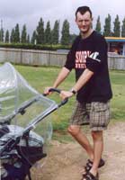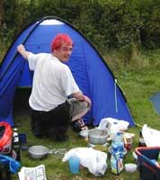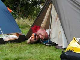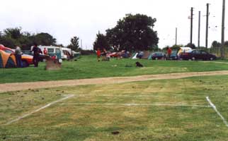 These turned up soon after Blyth arrived. People had been advised to arrive early, in order to get the cricket in before bands kicked off at around 6.30. Ufford used to feature a couple of sets from Blyth, and occasionally a support band, but this year we had rather ambitiously invited all kinds of exciting people to come and play. Paradise Regained Cricket started around three-ish I think. Enough people had finished setting up tents and wandered over to make up two sprawling teams. TDL cunningly avoided being picked last by making himself one of the captains. His masterstroke of strategy was in picking Signalman White, but the folly which inspired him to bat first, after winning the toss, was breathtaking in its stupidity. Despite the best efforts of his cohort, Blyth were all out for 55. Rules were tip and run, one batsman up at a time, no slogging (over the hedge was 6 and out), and tennis balls were used throughout owing to the proximity of people's tents, vehicles, babies etc.
